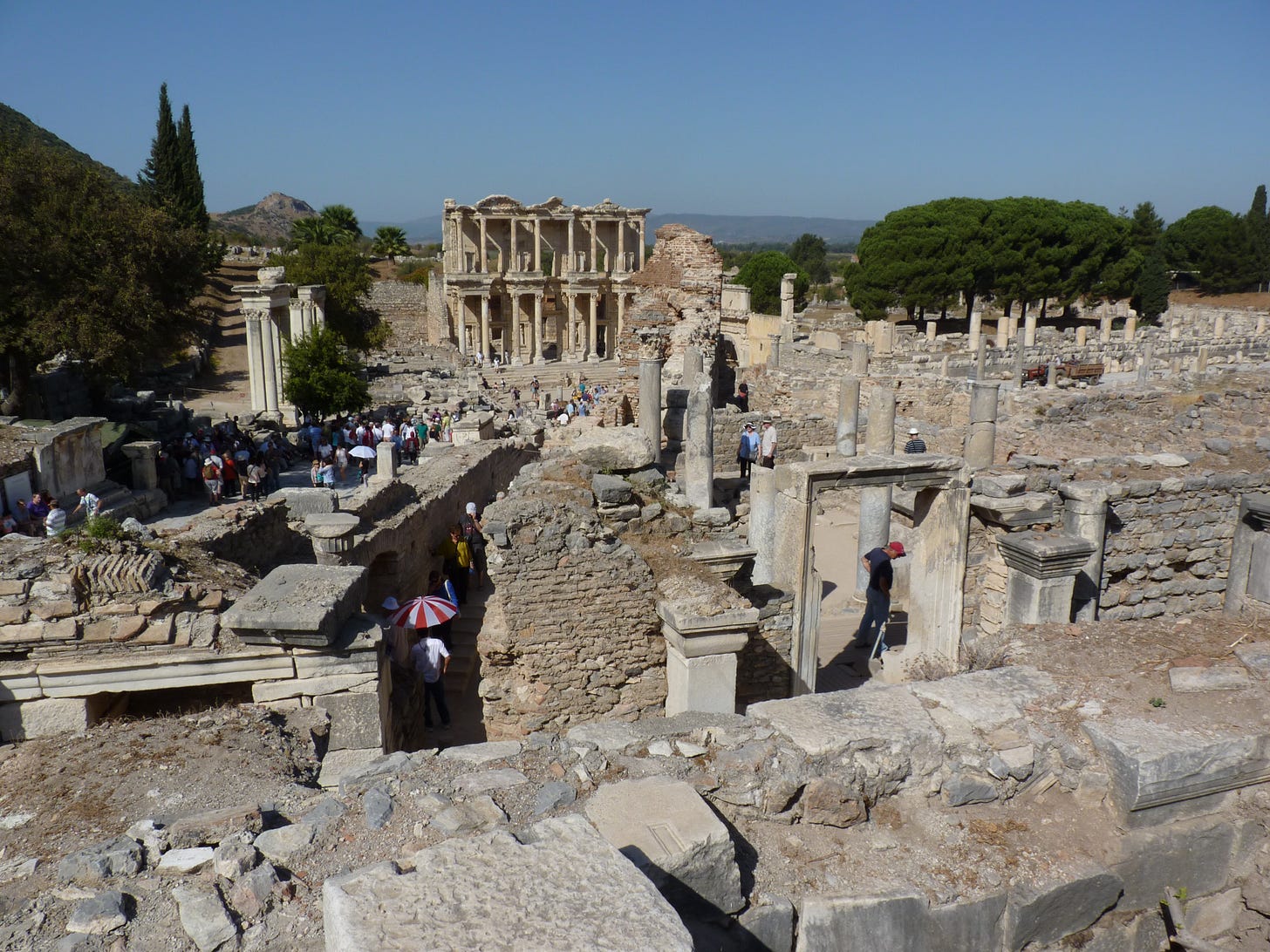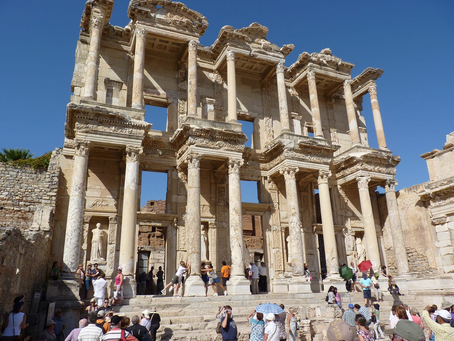 As well as its famed temple to Artemis (which Alexander the Great rebuilt) there was also the Library of Celsus, built by Gaius Julius Aquila to honour his father in 110 AD. Either side of its main portal statues of Wisdom and Virtue were frozen in aspects of solemnity. It was once three stories tall and crammed with manuscripts from across the ancient world. Its many wide windows enabled light to pour inside. Such places as these inspire within me the desire to be able to travel back in time to see what they contained.