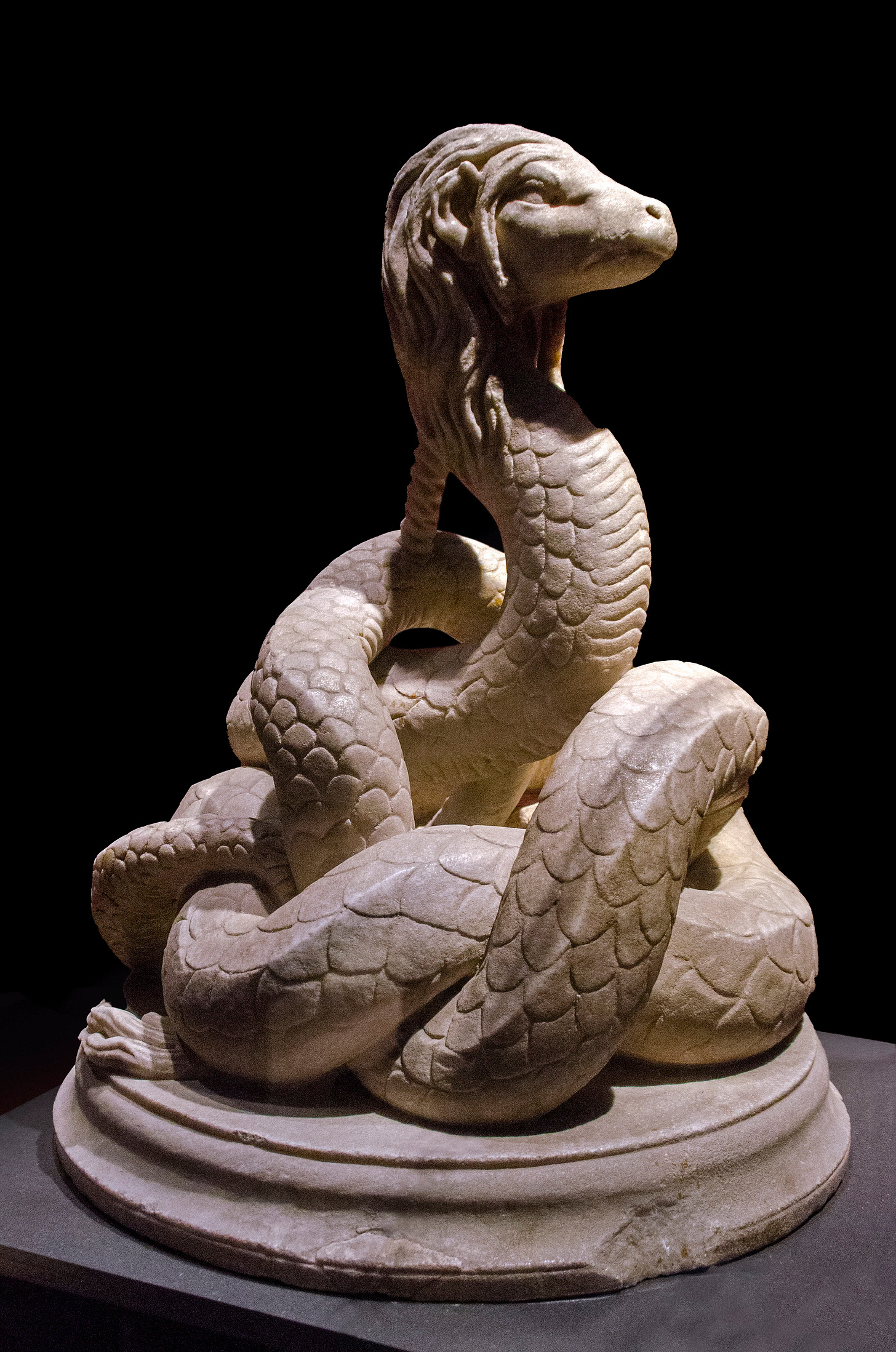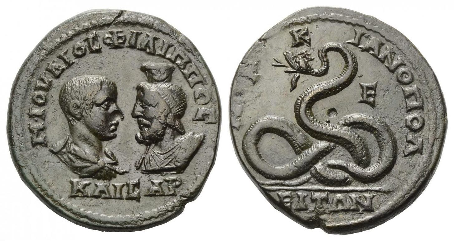 Whether or not the human-masked Glycon was fraud or a part of a genuine cult is debatable. Lucian ridiculed its founder as a charlatan. As a contemporary of Aléxandros they became sworn enemies, as Lucian ridiculed the oracle’s career. He even travelled to confront Aléxandros, a meeting that nearly wound up with Lucian being lynched by followers of Glycon. But Lucian had his own reasons for despising the cult, and anger propelled his criticism of Aléxandros’ doings. There were many other serpent sects around at the time, inspired by early systems of thought and falling under the umbrella of gnosticism, such as the Ophites. Glycon’s Cult spread across Asia Minor and outlived its founder, Aléxandros, by a century. The imagery of the giant serpent was an ancient concept, it had pedigree, lineage. Glycon was the son of Apollo, the god of prophecy. Many at the time would have been familiar with the myth that he slew the giant serpent, Python, at the shrine of Delphi. If Glycon was even a symbolic manifestation of such ideas, then he bore resonance with the people (fat-heads, as Lucian calls them). His followers believed, they obtained some benefit knowing he was there, visiting his shrine, seeking answers to the tumult of their lives – and in this respect doesn’t that tick the criteria of being a deity? a living god?